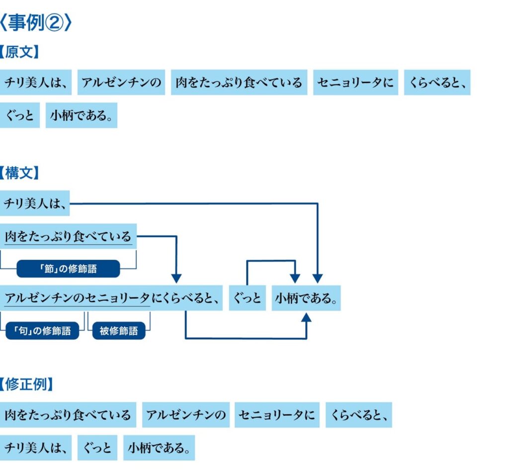 という四つの「語順の原則」を提唱します。中でも①と②の原則は重要で、「チリ美人」の文章の修正はこれに則ったものだとしています。
