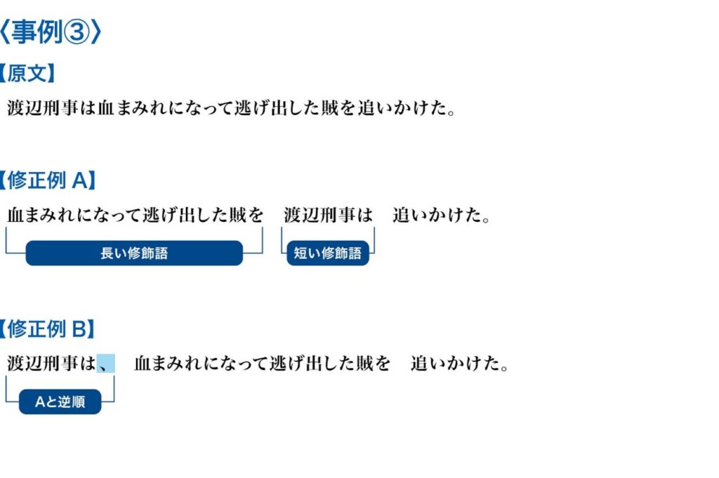こうした著書の中の「第三章 修飾の順序」章の「語順の第一原則」に則って、「長い方を前に」および「節を前、句を後」にして